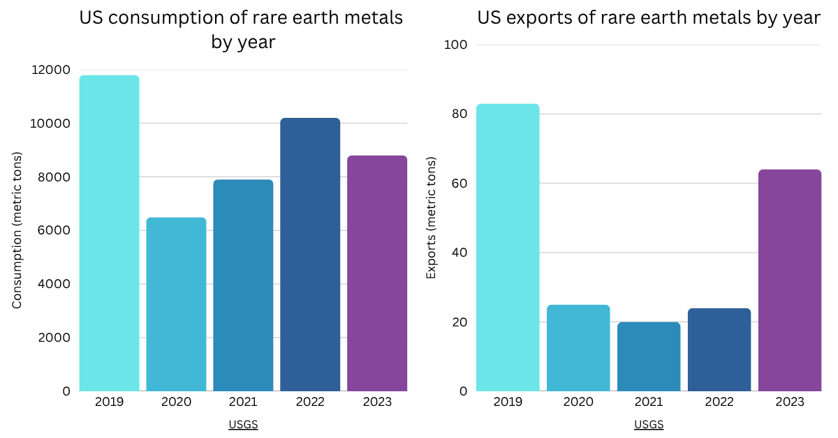 US consumption and exports of rare earth metals. Data from USGS