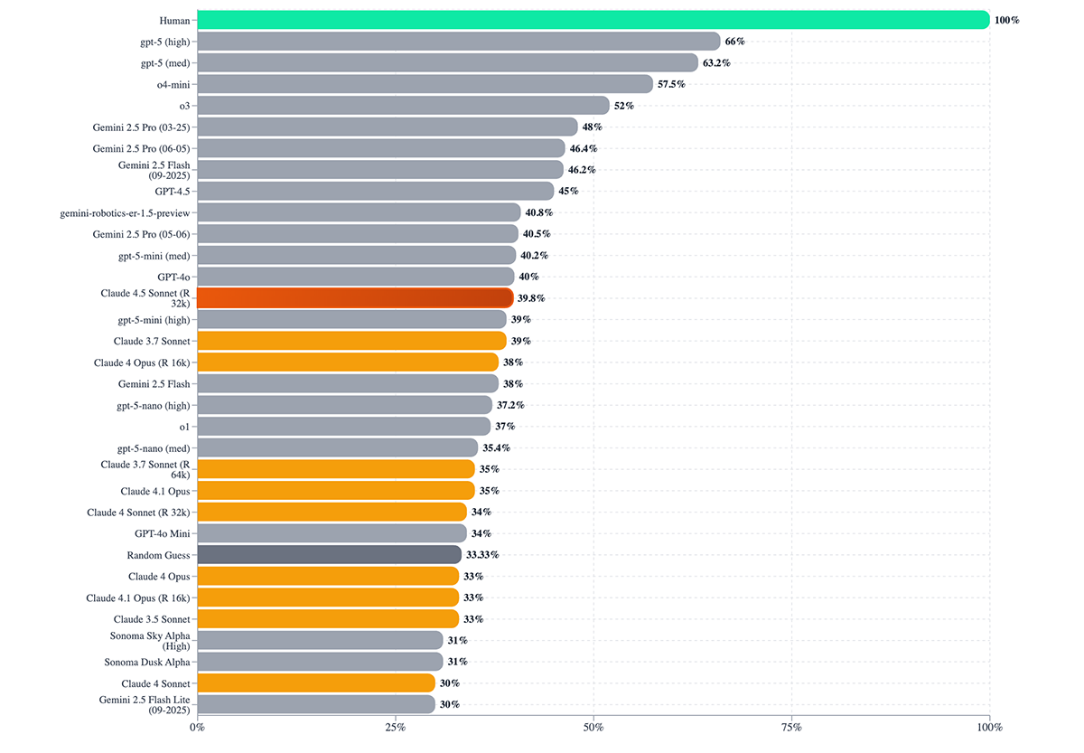 Physics intuition. Community runs on the VPCT (ball-and-bucket toy problems) suggest Sonnet 4.5 hovers around 39.8%—not far above random guessing (33.3%) and far below humans (100%). That’s your robotics/automation caveat: great at the software layer; still brittle at grounded physical prediction.
