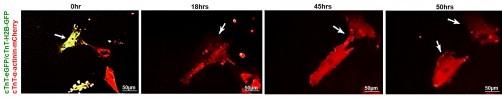 A still image from live microscopy. Images from left to right – the cell in the initial frame is from a 55-year-old donor heart. The next image shows the cell rounding up after receiving Cyclin A2 and the cell division takes place shortly after. The third image represents the same heart muscle about to split apart into two daughter cells. The last image is the end result of that division where the cell in image one has now fully divided into two cells. Credit: Mount Sinai Health System
