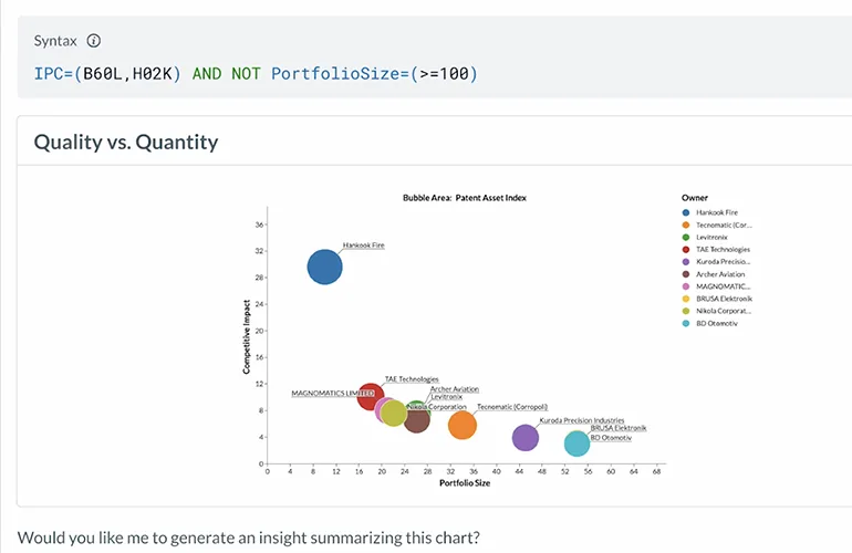The assistant parses a user’s prompt, maps it to PatentSight+ analysis steps and returns charts and tables with the full query it executed so results can be reproduced inside the platform. Answers draw on a harmonized global database of more than 90 million patent family records with ownership normalization, legal-status tracking, and 100+ attributes and measures, including the Patent Asset Index. (The Index weights patents using citation impact and market coverage.)