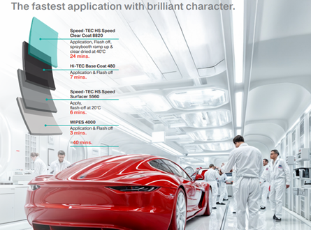 Axalta delivers the system through three of its brands: Cromax (as the Ultra Performance Energy System), Spies Hecker (under the Speed-TEC product family) and Standox (as the Xtreme System). It consists of a new clearcoat, the final coat applied over the base coat, and a new surfacer, a sandable coating applied before the base coat.