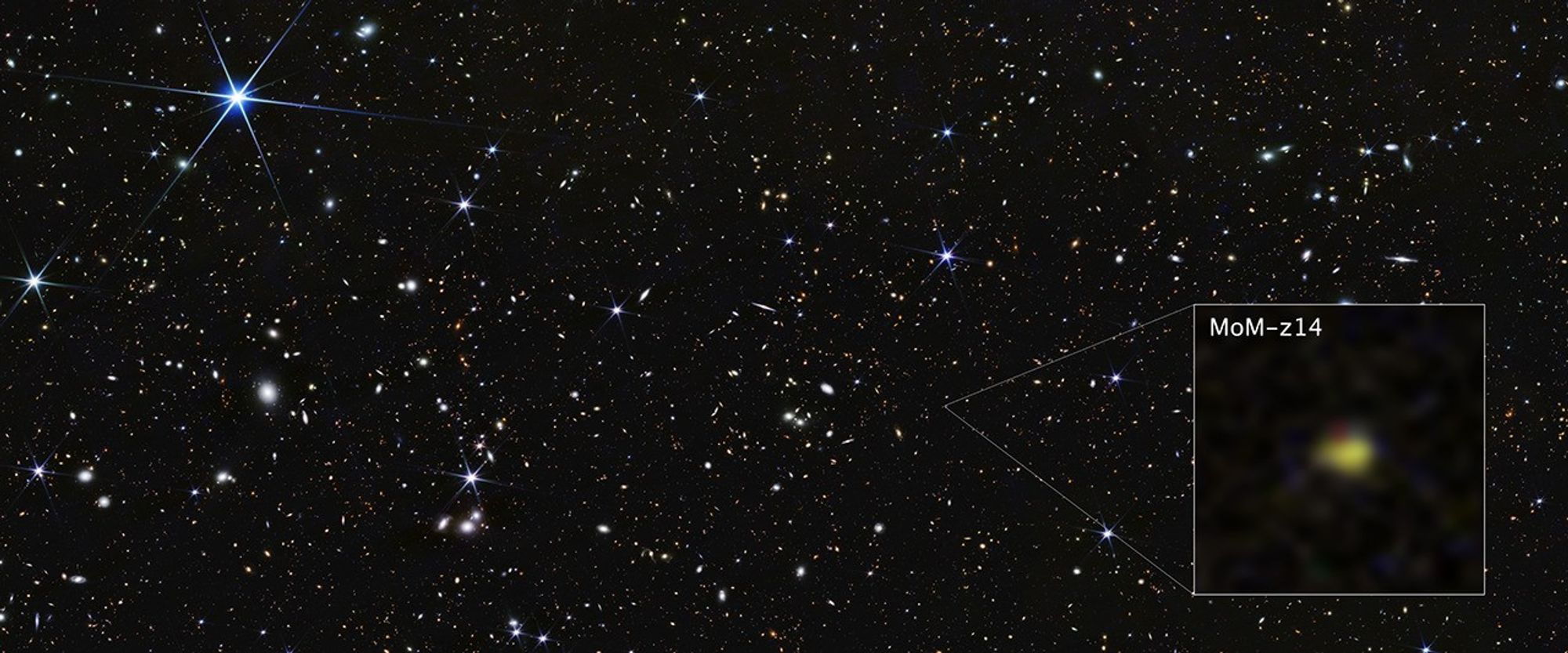 NASA’s James Webb Space Telescope shows galaxy MoM-z14 as it appeared in the distant past, only 280 million years after the universe began in the big bang. Image: NASA, ESA, CSA, STScI, Rohan Naidu (MIT); Image Processing: Joseph DePasquale (STScI)