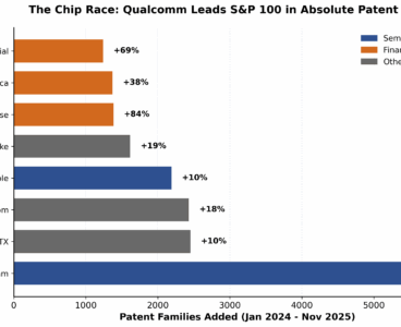 The intensity of the chip race is written in the patent data. Between early 2024 and late 2025, Qualcomm added nearly 6,000 active patent families to its portfolio, a 25% jump that makes it the S&P 100’s single biggest gainer in absolute terms. Rival Nvidia expanded its own IP moat by 21% over the same period.…